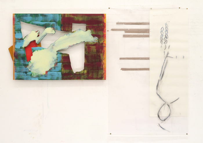 Augenbänder und Echoraum 5, 2021, Acryl, Öl auf Holz cutout, Hartfaser; Farbstift auf Transparentpapier, Papier, 102 x 140 x 3 cm (3-teilig)