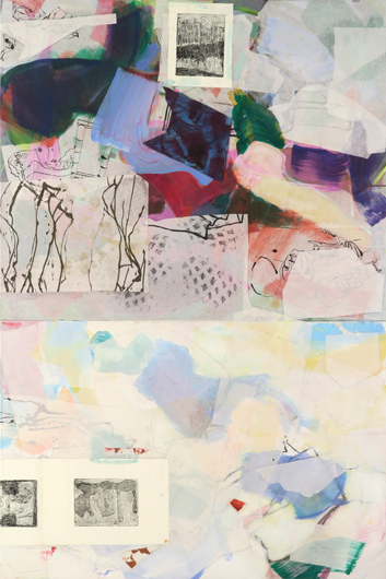 Wie sie die offene Ebene, 2020-22, Acryl, Hartfaser, Tusche, Radierung auf Bütten, Chinapapier auf Leinwand, 180 x 120 cm