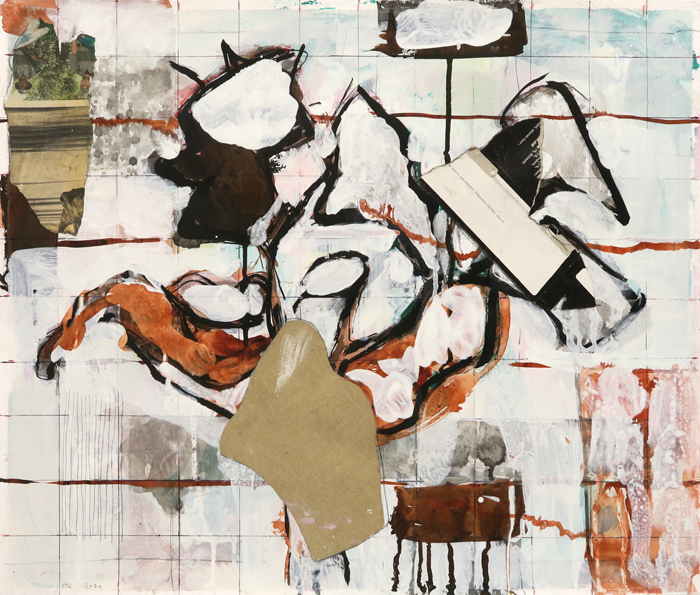 AufderStelle/Baum, 2021, Acryl, Bleistift, Tusche, bedrucktes Papier, Leinwand auf Papier, 50 x 60 cm