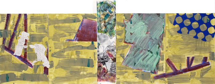 VierBlätterKopf, 2013, Acryl, Aquarell, Bleistift, Ölzeichnung, Tusche, Papier auf Papier, 76 x 192 cm