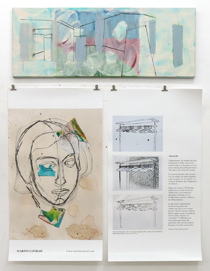 Siebzehn Monaden 4, 2013-2015, Acryl, Öl auf Leinwand, Laserdruck auf Papier, 160 x 115 cm (3-teilig)