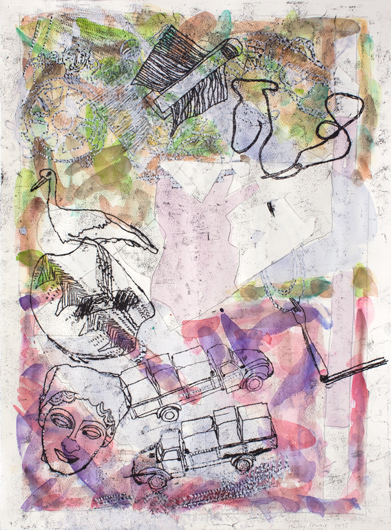 Der Eine schreibt, der Andere ist /5, 2013, Aquarell, Ölzeichnung auf Papier, 76 x 56 cm
