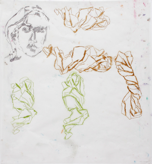 T4-SiennaOliv, 2016, Farbstift, Kugelschreiber auf Transparentpapier, 63 x 58 cm