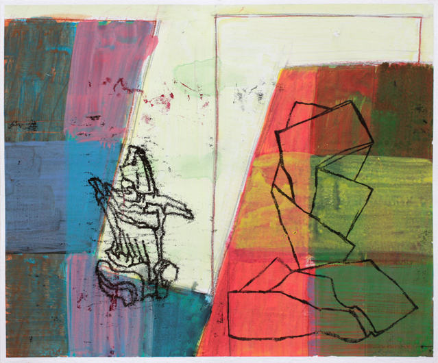 Felder Umschrittenwerden 5, 2015, Acryl, Farbkreide, Ölzeichnung auf Papier, 50 x 60 cm