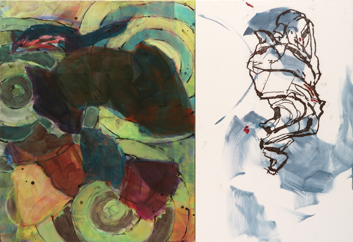 Mit Steinen Schwimmen 4 (sienna), 2018-19, Acryl, Ölzeichnung auf Leinwand, 125 x 180 cm (2-teilig)