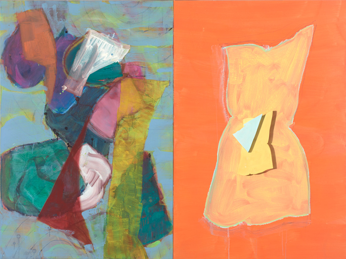 Mit Steinen Schwimmen 9 (orange), 2018-19, Acryl, Holz auf Leinwand, 120 x 160 x 5 cm (2-teilig)