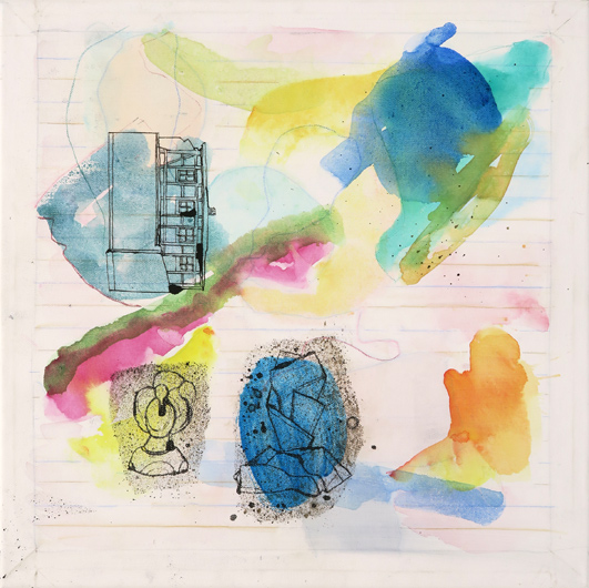 Im Schatten Sommersprossen bekommen 2, 2019, Aquarell, Farbstift, Tusche auf Leinwand, 46 x 46 cm