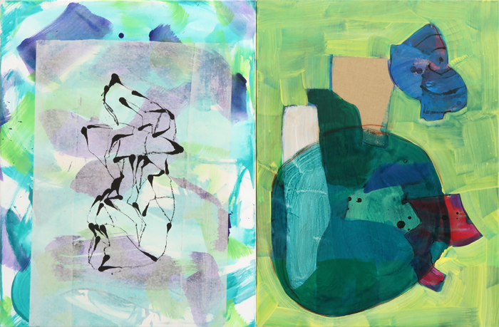 Mit Steinen Schwimmen 7 (grün), 2018-19, Acryl, Chinapapier, Tusche auf Leinwand, 77 x 117 cm (2-teilig)