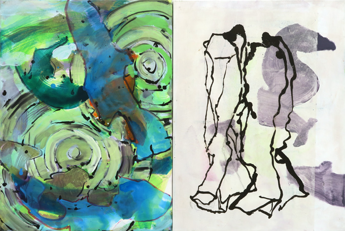Mit Steinen Schwimmen 6 (grünblau), 2018-19, Acryl, Chinapapier, Tusche auf Leinwand, 77 x 114 cm (2-teilig)