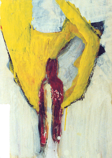 FigurMantelGelb, 1983, Acryl, Farbkreide, Kohle, Lack auf Papier, 30 x 21 cm