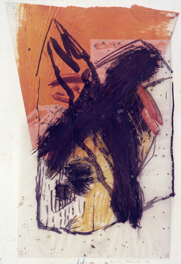 VogelKircheOrange, 1984, Acryl, Kohle, Transparentpapier auf Papier, 50 x 35 cm