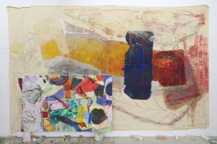 Nüsse Stehen-Liegen, 1983, Acryl, Kohle, Öl, Papier auf Baumwolltuch, 285x450 cm und Safrangelbes Jagdgewand mit rotem Saum 1, 2021, Acryl, Chinapapier, Tusche auf Leinwand, 125x200 cm