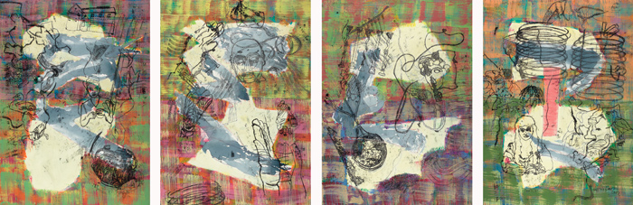 Niemandlandis 1-4, 2012, Acryl, Öl, Tusche auf Leinwand, 130 x 386 cm