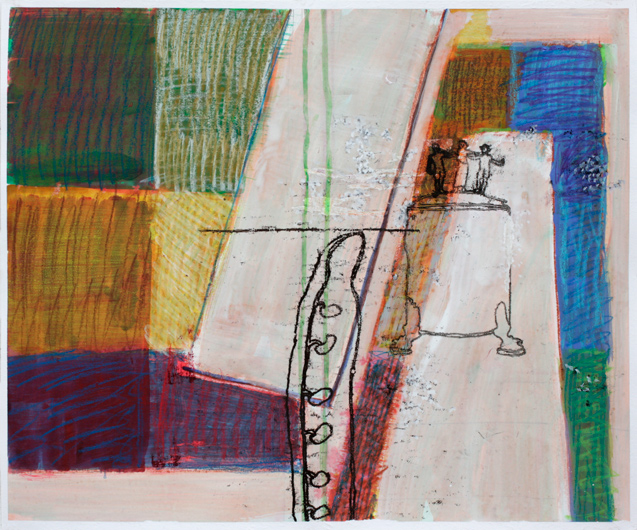 Felder Umschrittenwerden 4, 2015, Acryl, Farbkreide, Ölzeichnung auf Papier, 50 x 60 cm