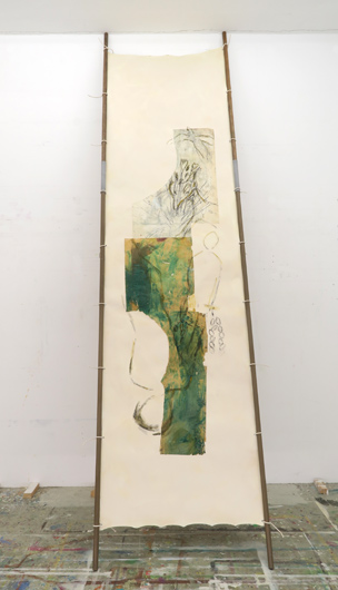 Schnabelspitze, 1982|2021, Acryl, Kohle, Papier auf Leinwand, Holzstäbe, 363 x 96 cm