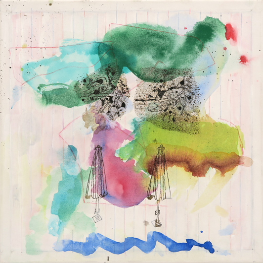 Im Schatten Sommersprossen bekommen 1, 2019, Aquarell, Farbstift, Tusche auf Leinwand, 44 x 44 cm