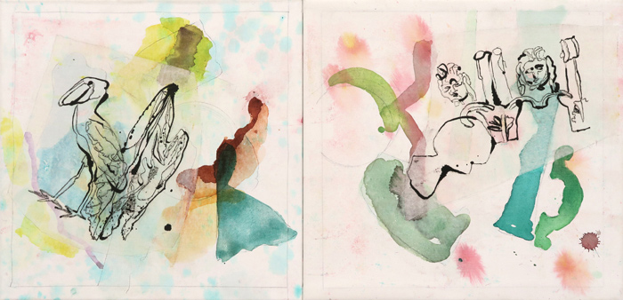 Spielplatz der Füchse 2/1, 2020, Aquarell, Chinapapier, Tusche auf Leinwand, 44 x 90 cm (2-teilig)