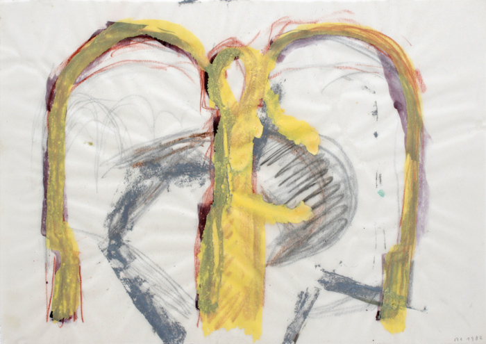 FigurBogenForm, 1982, Acryl, Farbstift, Lack, Rötel auf Transparentpapier, 21 x 30 cm